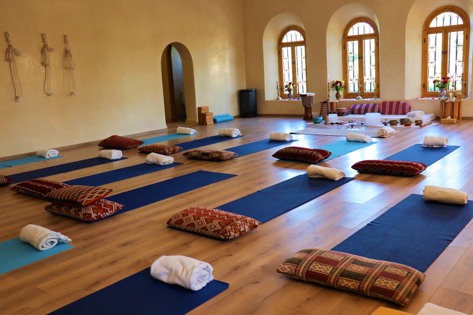 Grandi spazi, enormi terrazzi, una piscina, l’hammam e angoli suggestivi, il tutto circondato da giardini fioriti, piante e ulivi dove, oltre a fare pratica, potremo rilassarci, leggere, meditare e sorseggiare tè, in un luogo dove il tempo ha i ritmi della natura.